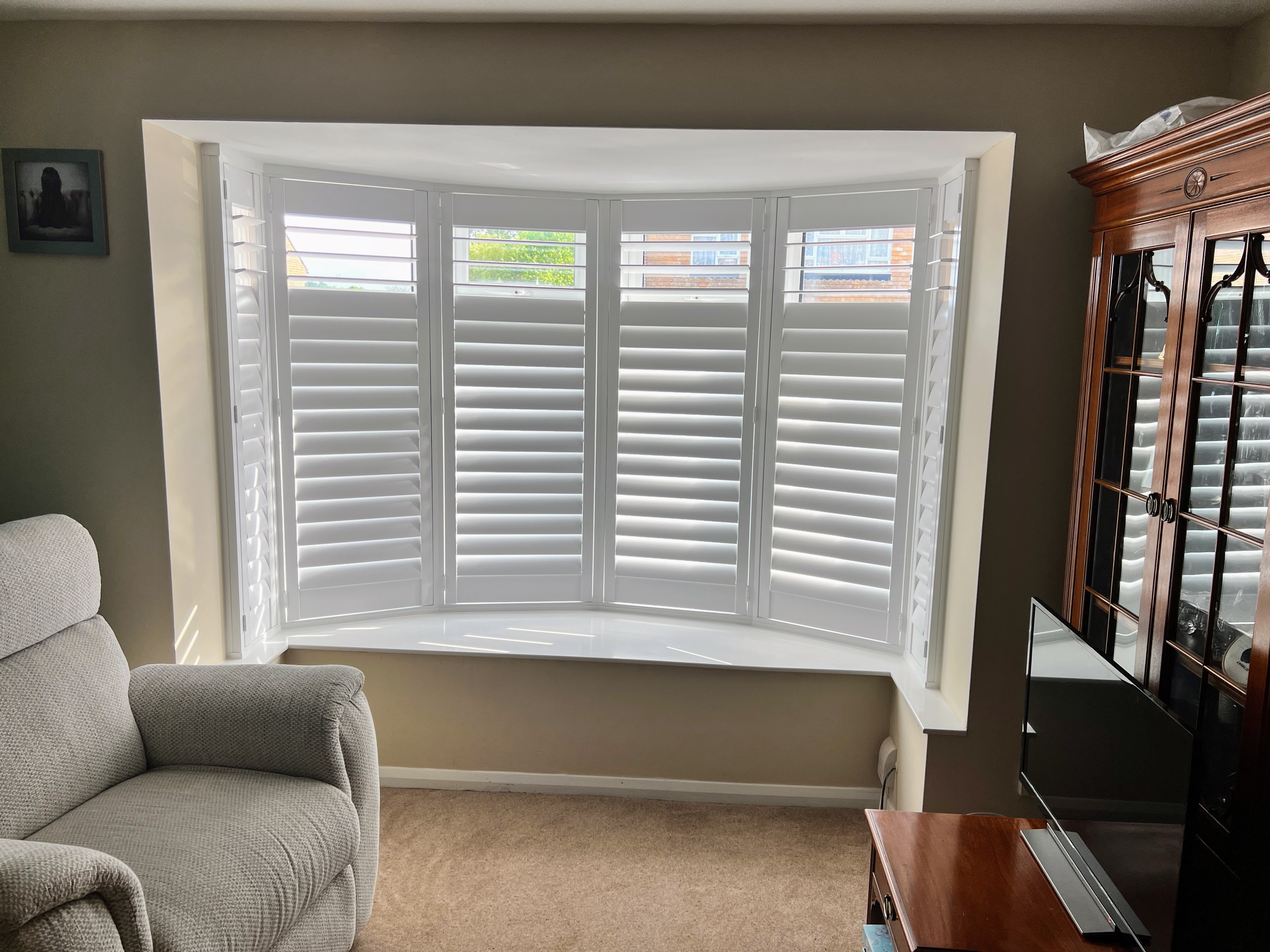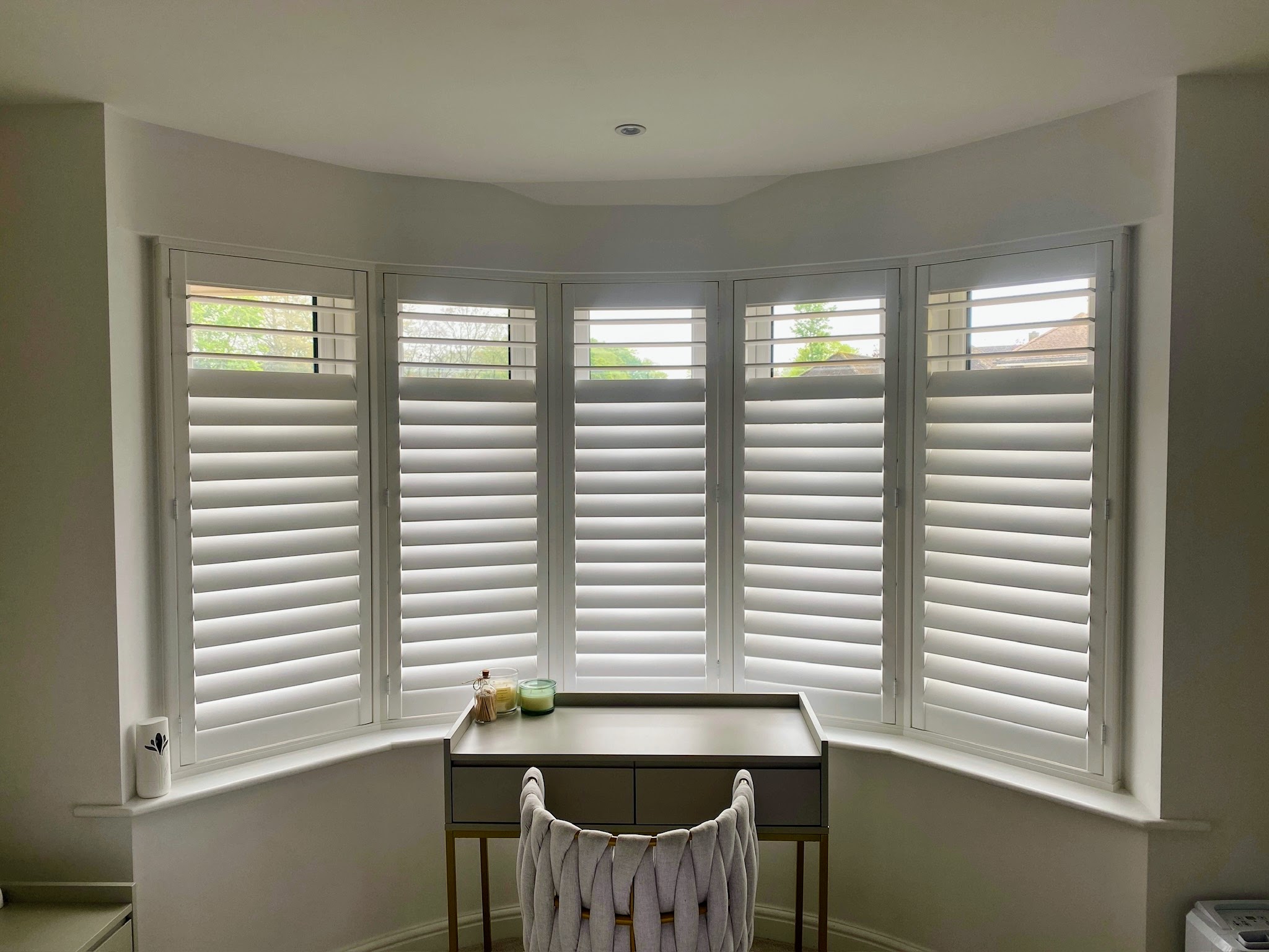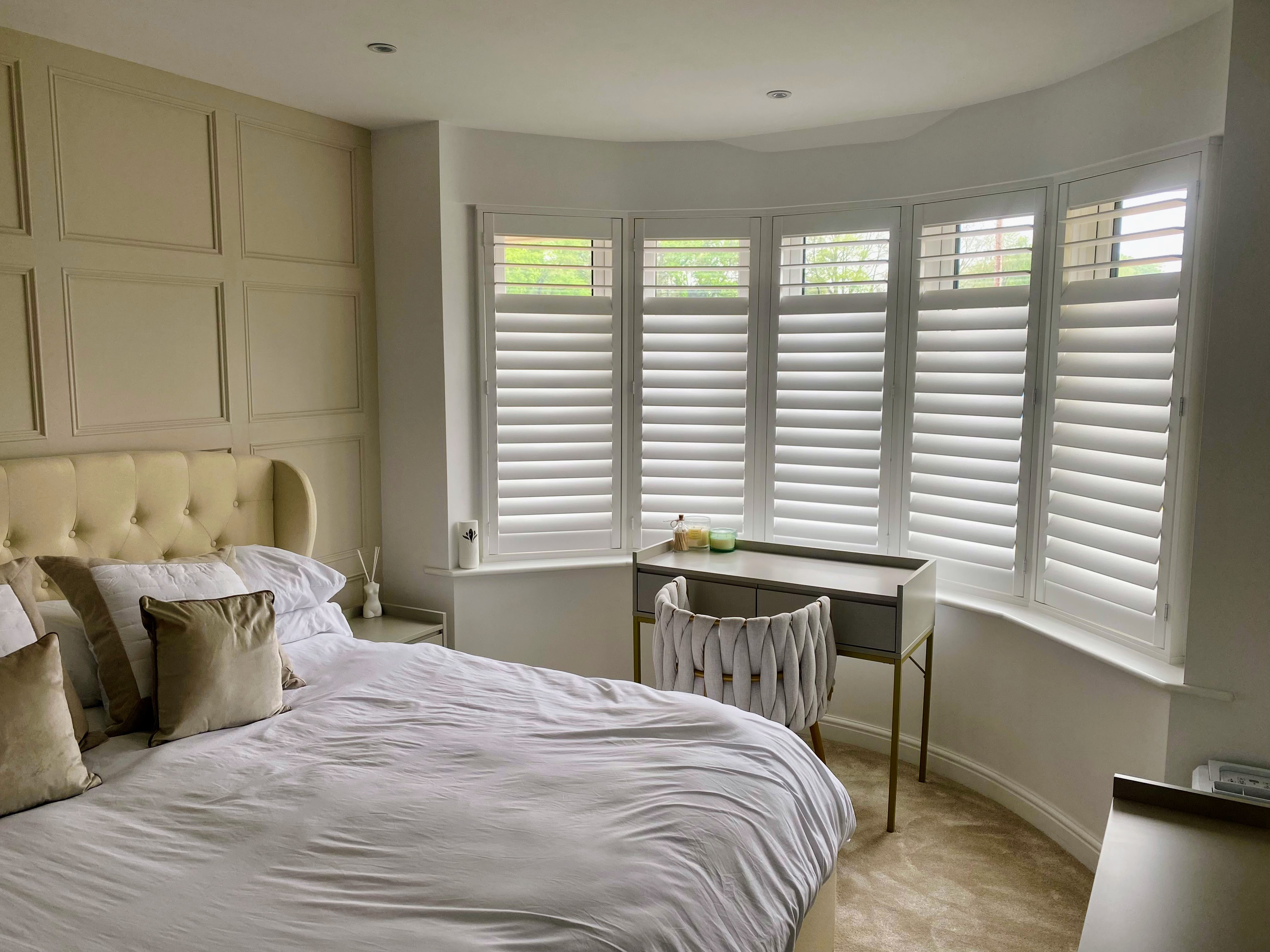 Shutters on rounded bay windows create a stunning focal point, highlighting the graceful curves of your bay that curtains often obscure. Custom-made for a flawless fit, they provide complete control over light and privacy, especially with our free privacy split upgrade. For insulation, light control, and timeless style, choose our durable EliteWood or CraftWood Range—designed to enhance both beauty and functionality.